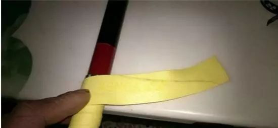 將先前剪好留有斜角的一面貼合握把末端的邊緣,然后均勻的纏繞起來,此時可稍微用點力,以防在今后使用中散掉。