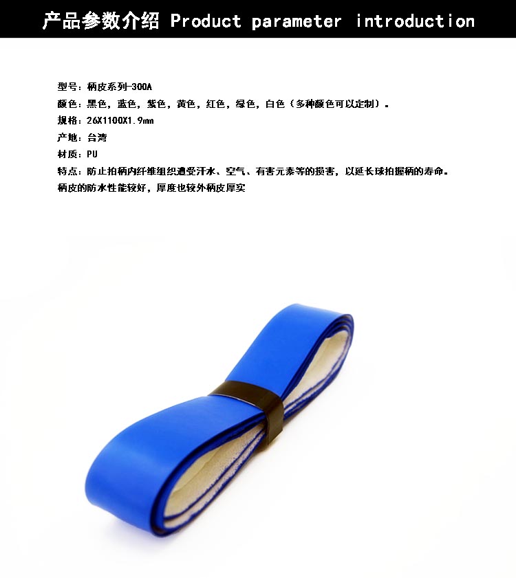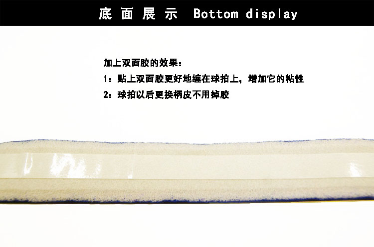 使用注意:柄皮有兩面,貼了雙面膠的是背面,纏時要把背面的雙面膠離型紙撕掉,再纏在球拍上,最后用封口條固定好。另外,柄皮是消耗品,表面磨破后需要及時更換手膠。